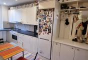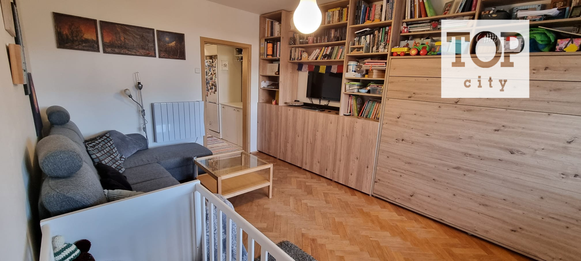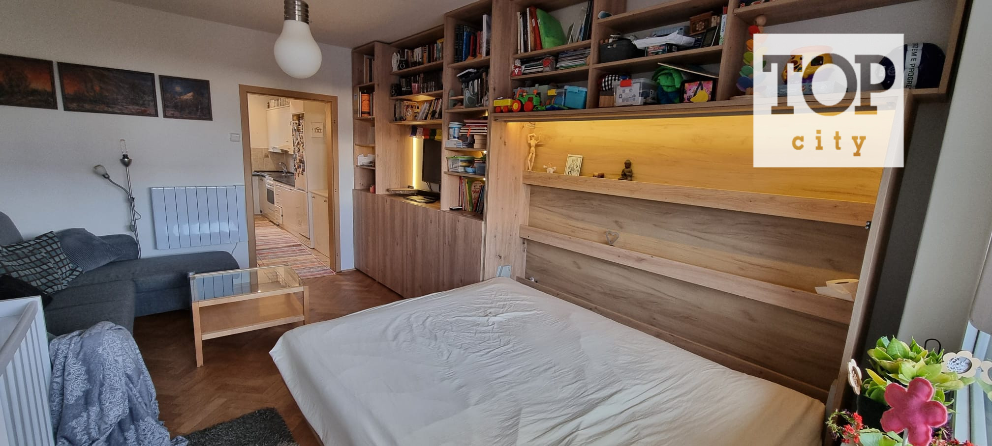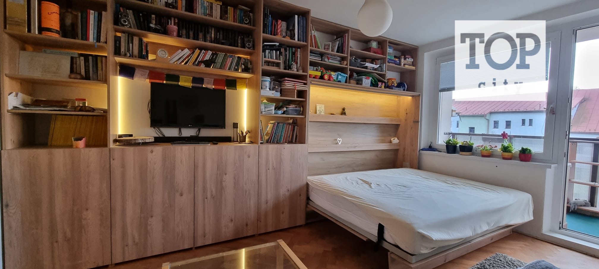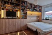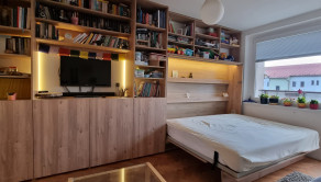 V obývačke je priestranný nábytok vyrobený na mieru. Poskytuje dostatok úložného priestoru. V rámci obývacej zostavy je zabudovaná výklopná manželská posteľ ktorú je možné používať podľa potreby t.j. dá sa vyklápať aj zaklápať podľa toho ako je to potrebné.